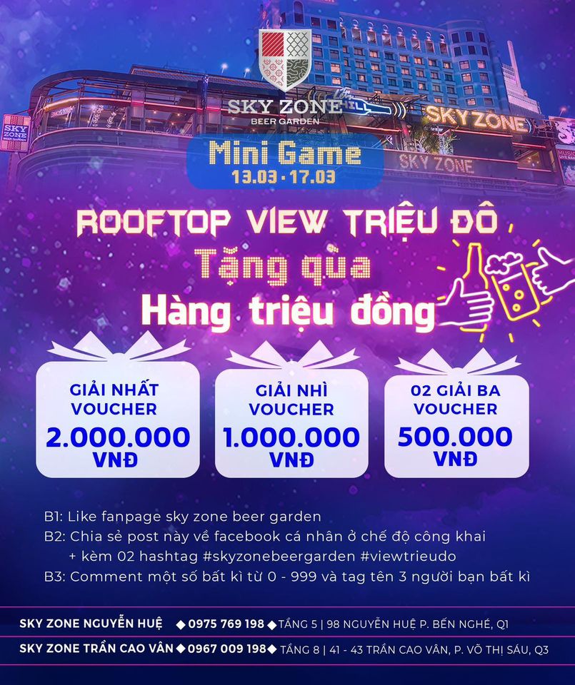 Bước 02: Chia sẻ post này về Facebook cá nhân ở chế độ Public (Công khai) + kèm 02 Hashtag #SkyZoneBeerGarden#viewtrieudo