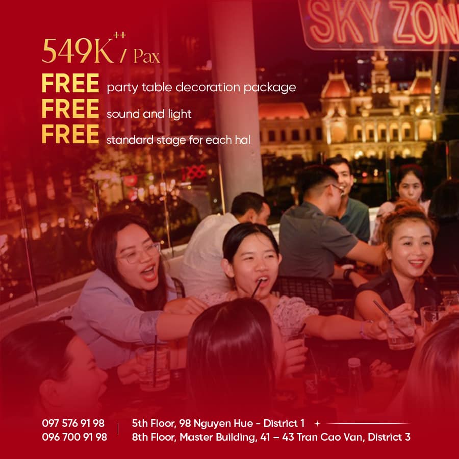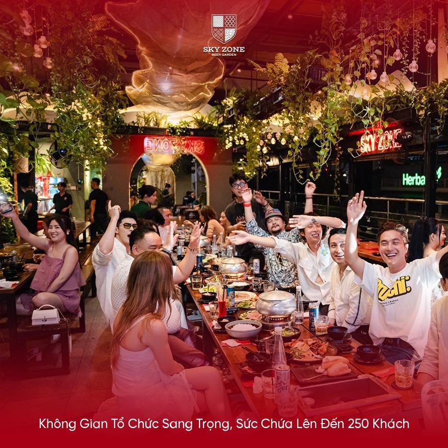 Thời điểm cuối năm cũng là lúc cùng nhau tạo nên những khoảnh khắc đáng nhớ trong Tiệc tất niên (Year- End Party). Tại Sky Zone Beer Garden với vị trí đắc địa giữa trung tâm TP.HCM, bạn sẽ được chiêm ngưỡng view triệu đô tuyệt đẹp, không gian mở rộng, hiện đại, có khả năng chứa lên đến 250 khách.